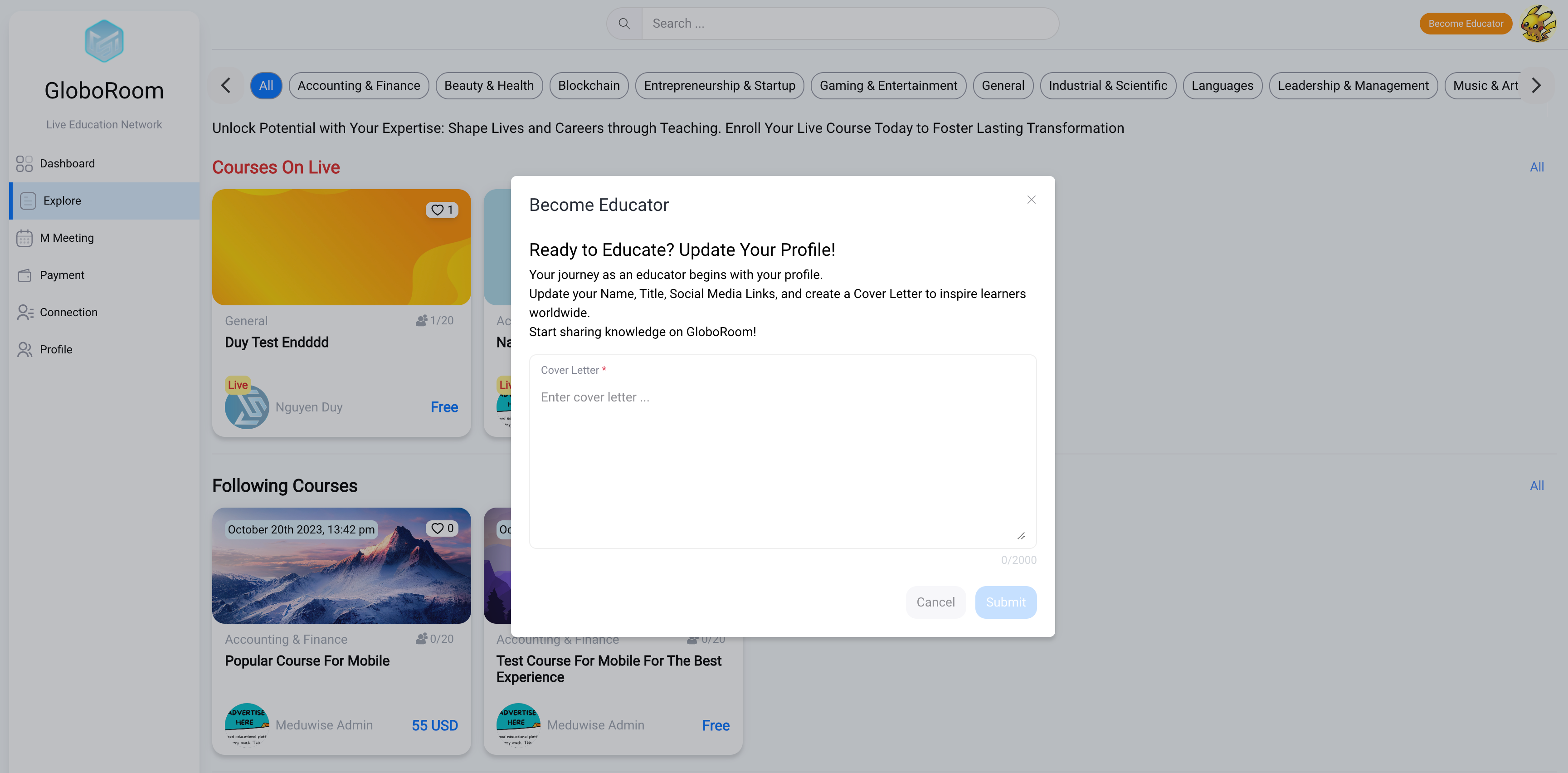 Your journey as an educator begins with your profile.Update your Name, Title, Social Media Links, and create a Cover Letter to inspire learners worldwide.